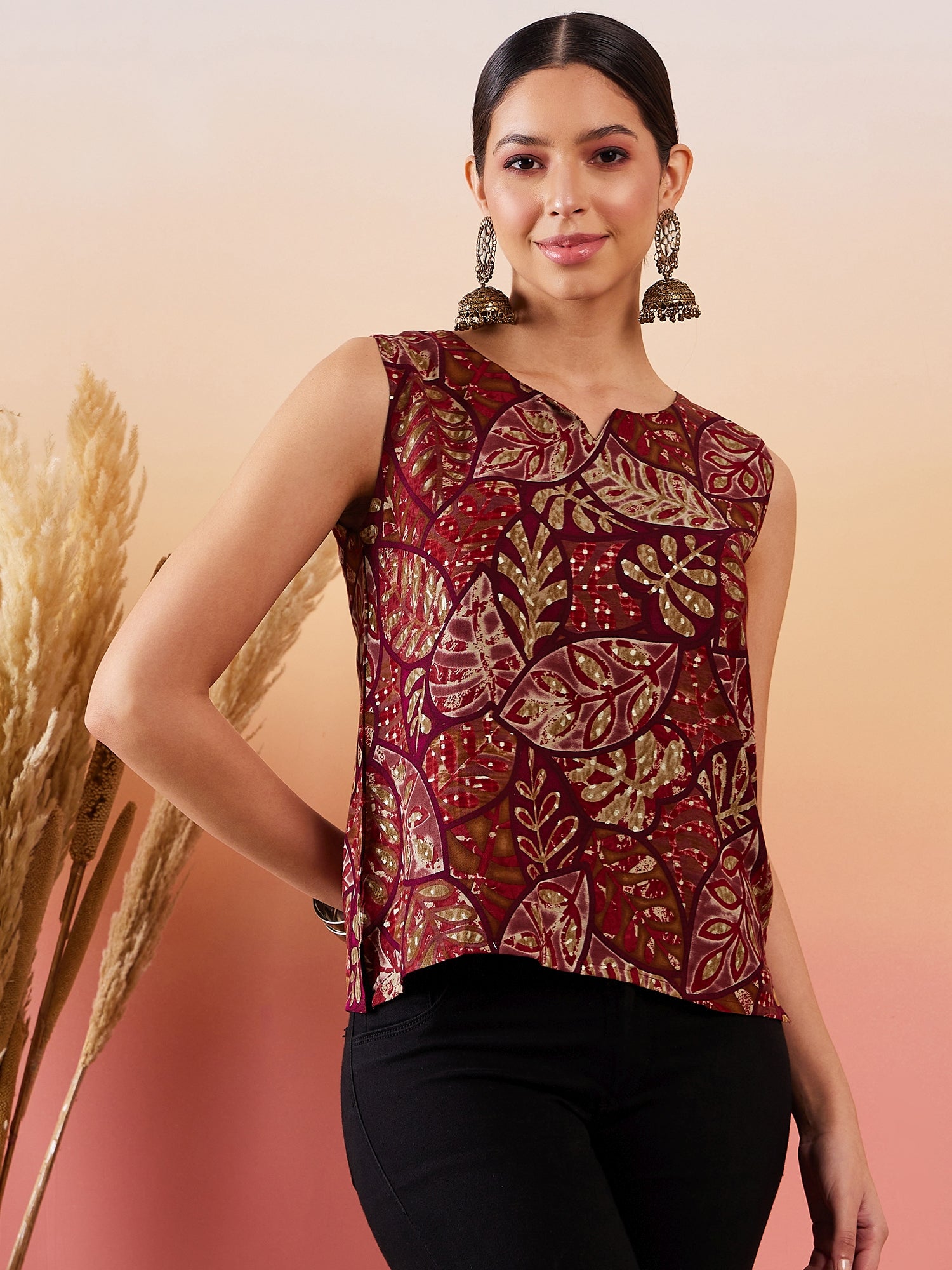 Placeholder Wine Maroon Leaf Print Foil Sleeveless Top - InWeave