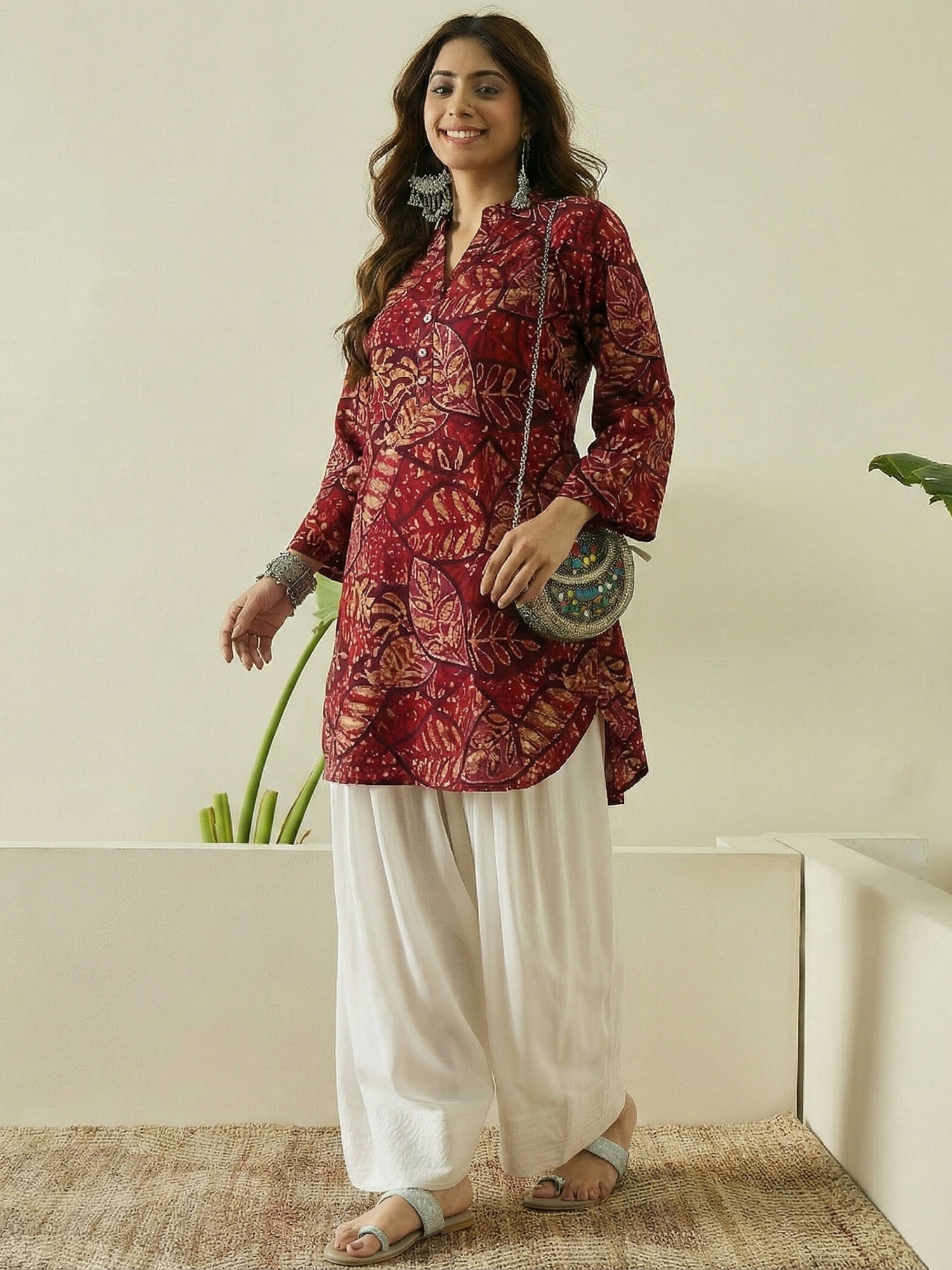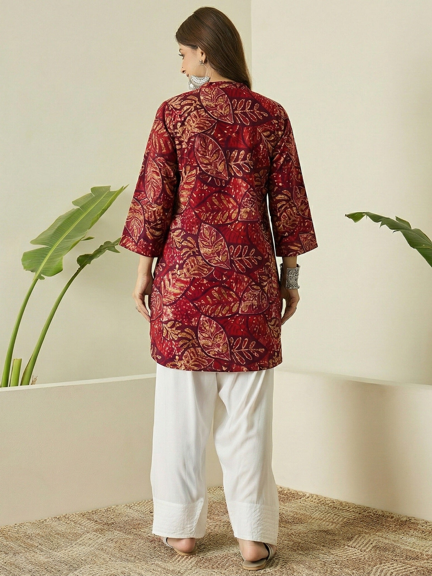 Wine maroon leaf printed kurta paired with white salwar, featuring comfortable fabric and elegant ethnic styling, suitable for festive occasions, casual gatherings, and everyday traditional wear.