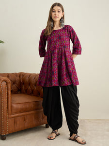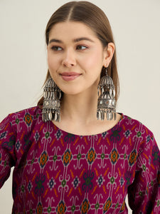 Wine Patola ikat kurta with maroon tulip pants. Delicate print and comfortable fit make this set ideal  for casual outings, festive daywear, and elegant everyday styling.
