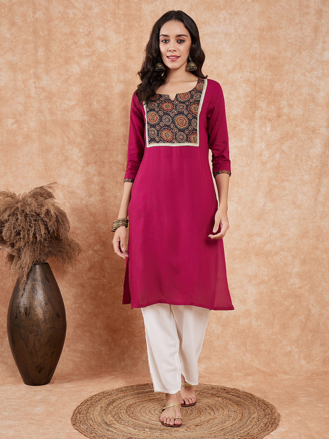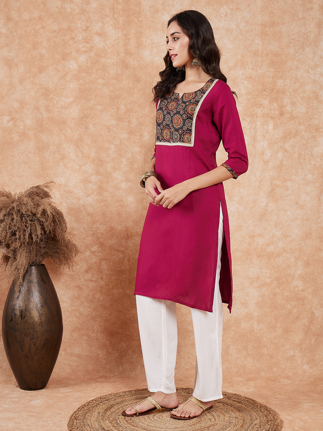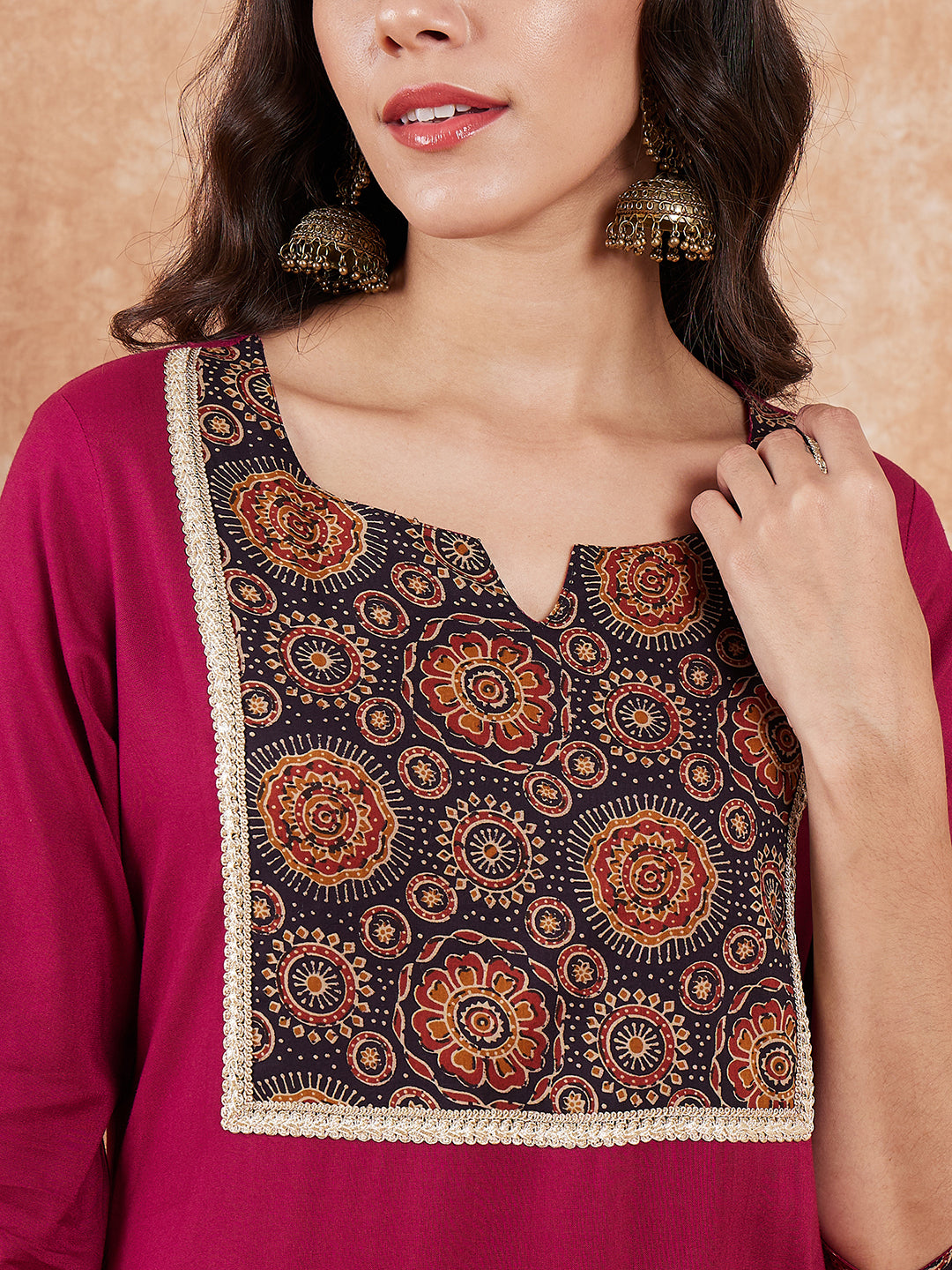 Placeholder Wine Printed Neck Patch Work Straight Kurta - InWeave