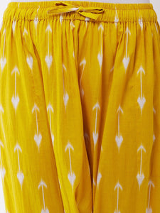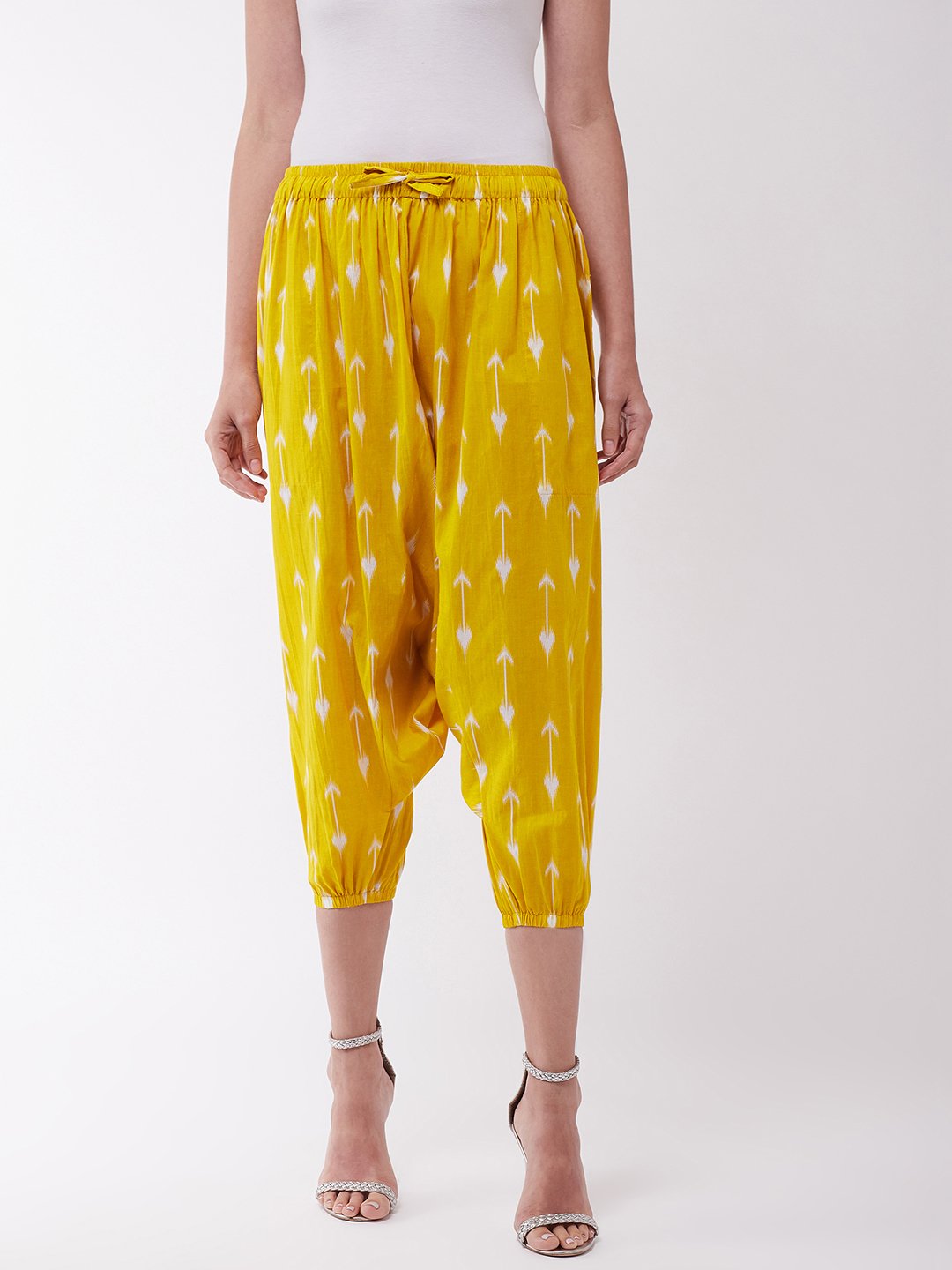 Stand out in the crowd even when outing with friends by wearing these yellow coloured harem pants. They have arrow prints and elasticated waist.
