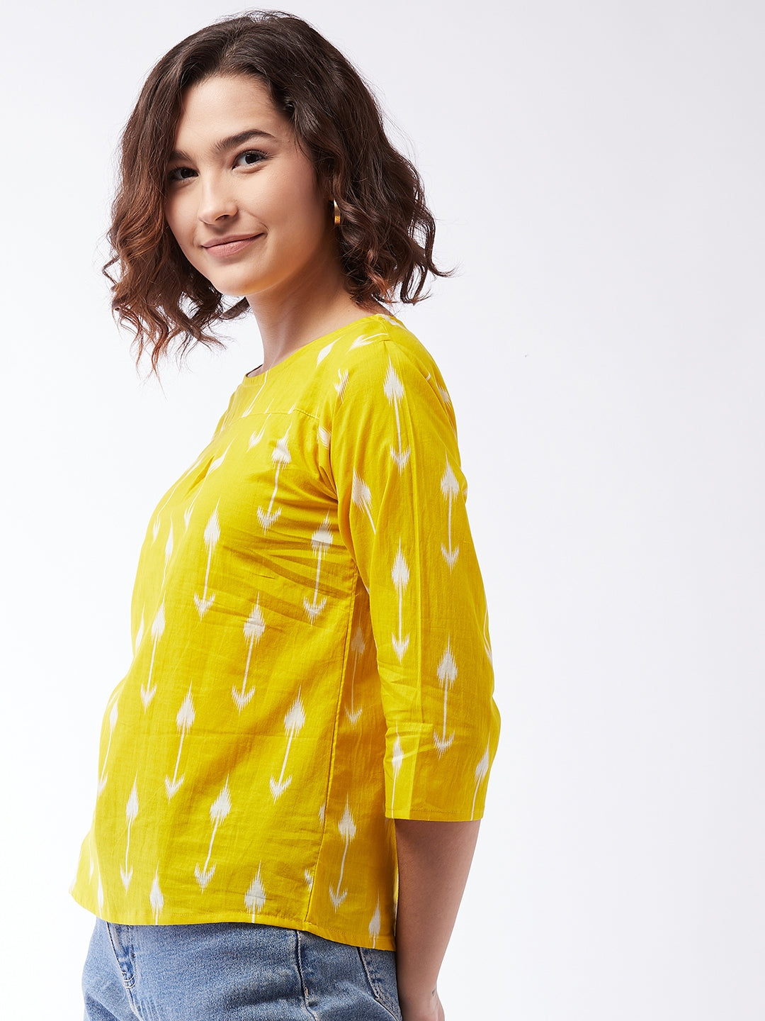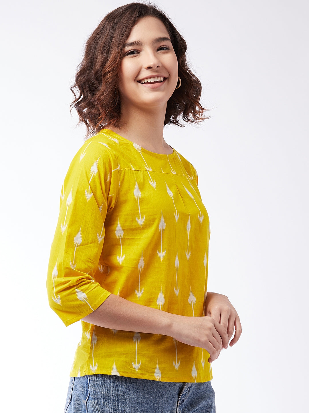 Prep up your pretty look by simply wearing this yellow coloured arrow printed top with a stylish skirt or pants. This comfy pure cotton top features quarter sleeves and round neck.
