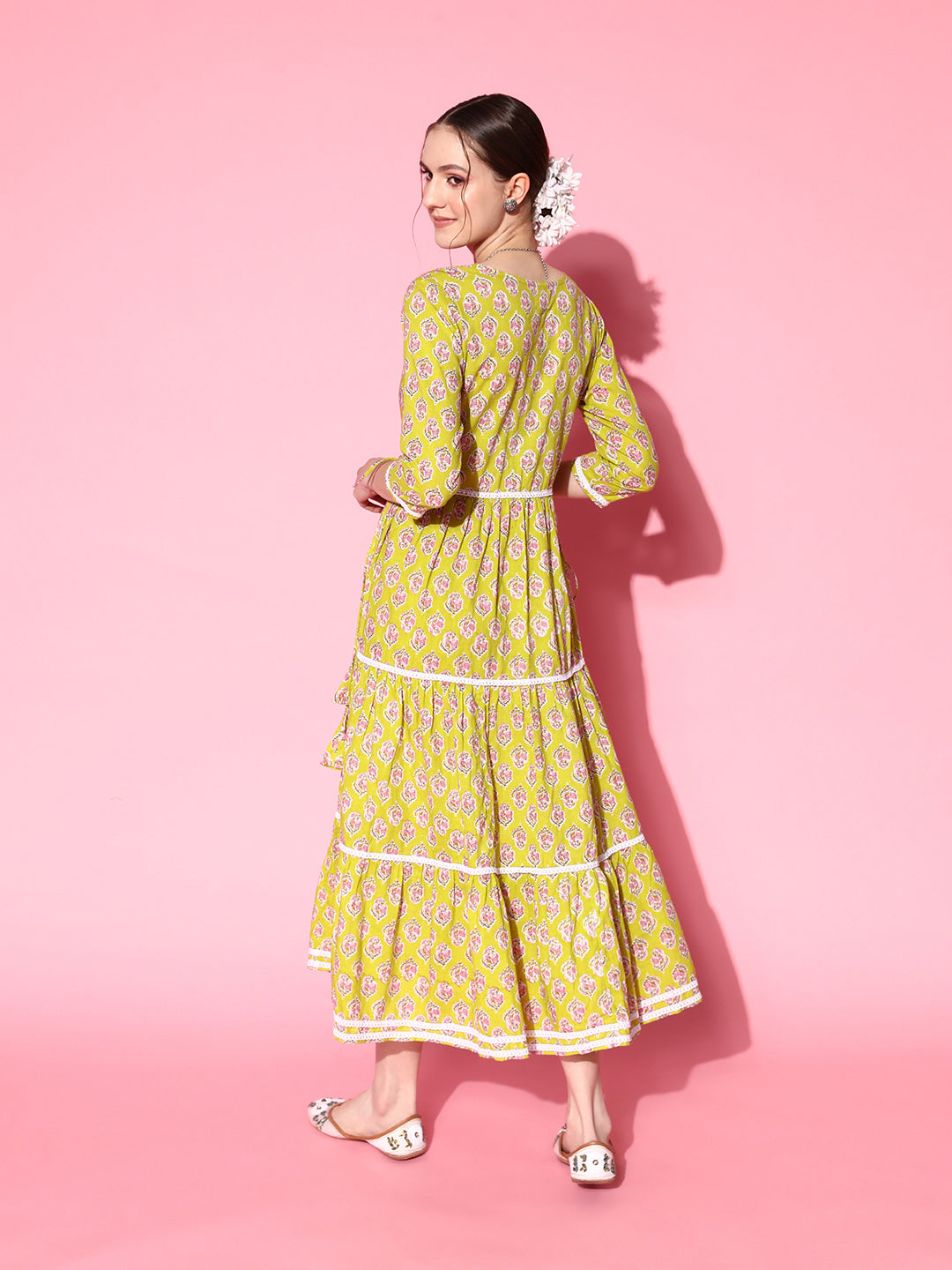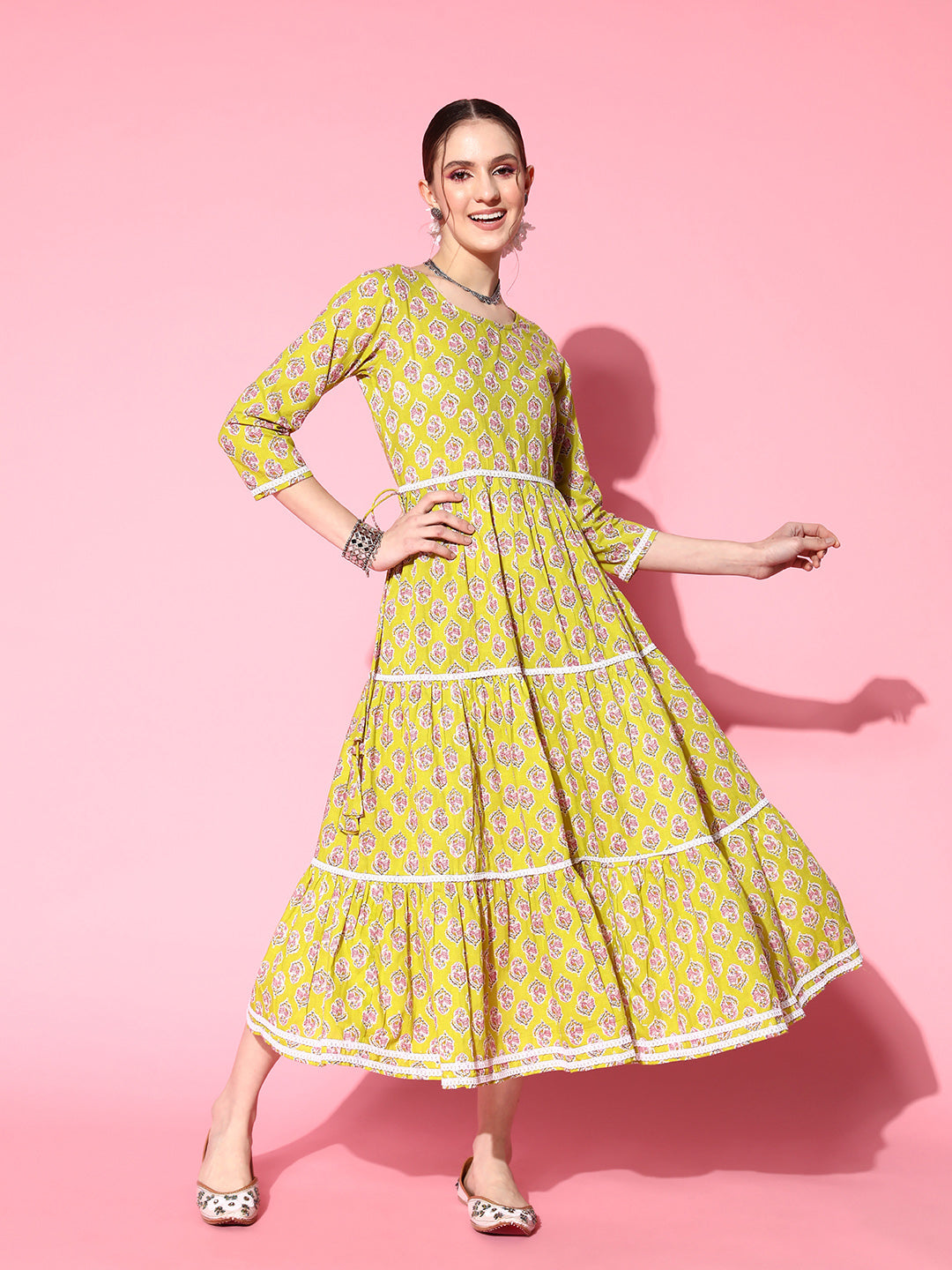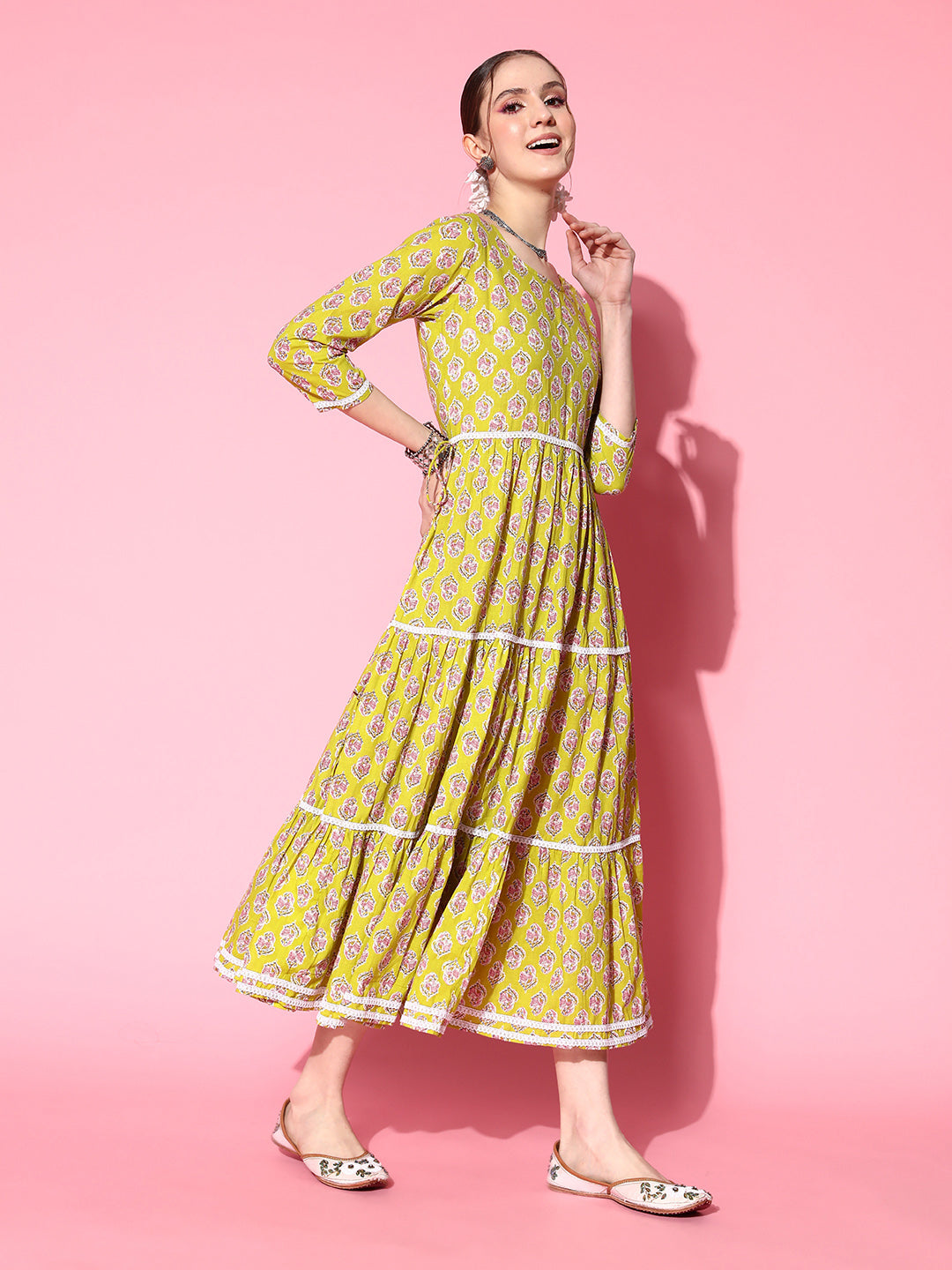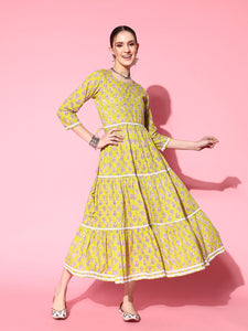 YELLOW FLORAL PRINT TIERED DRESS WITH LACE