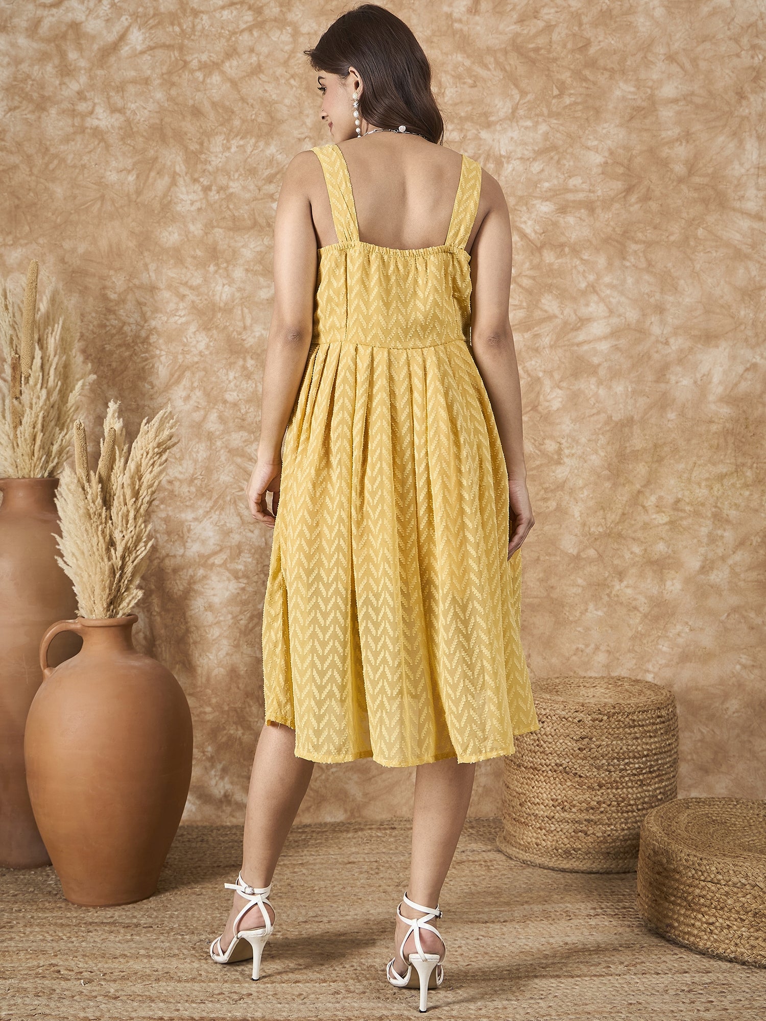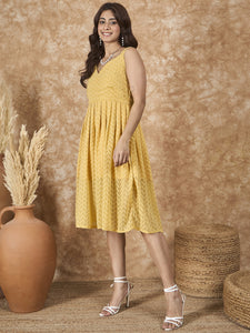 A vibrant yellow georgette dress featuring a flattering sweetheart neckline. The lightweight fabric offers a soft, flowing fit, making it perfect for daytime events or a casual evening out.