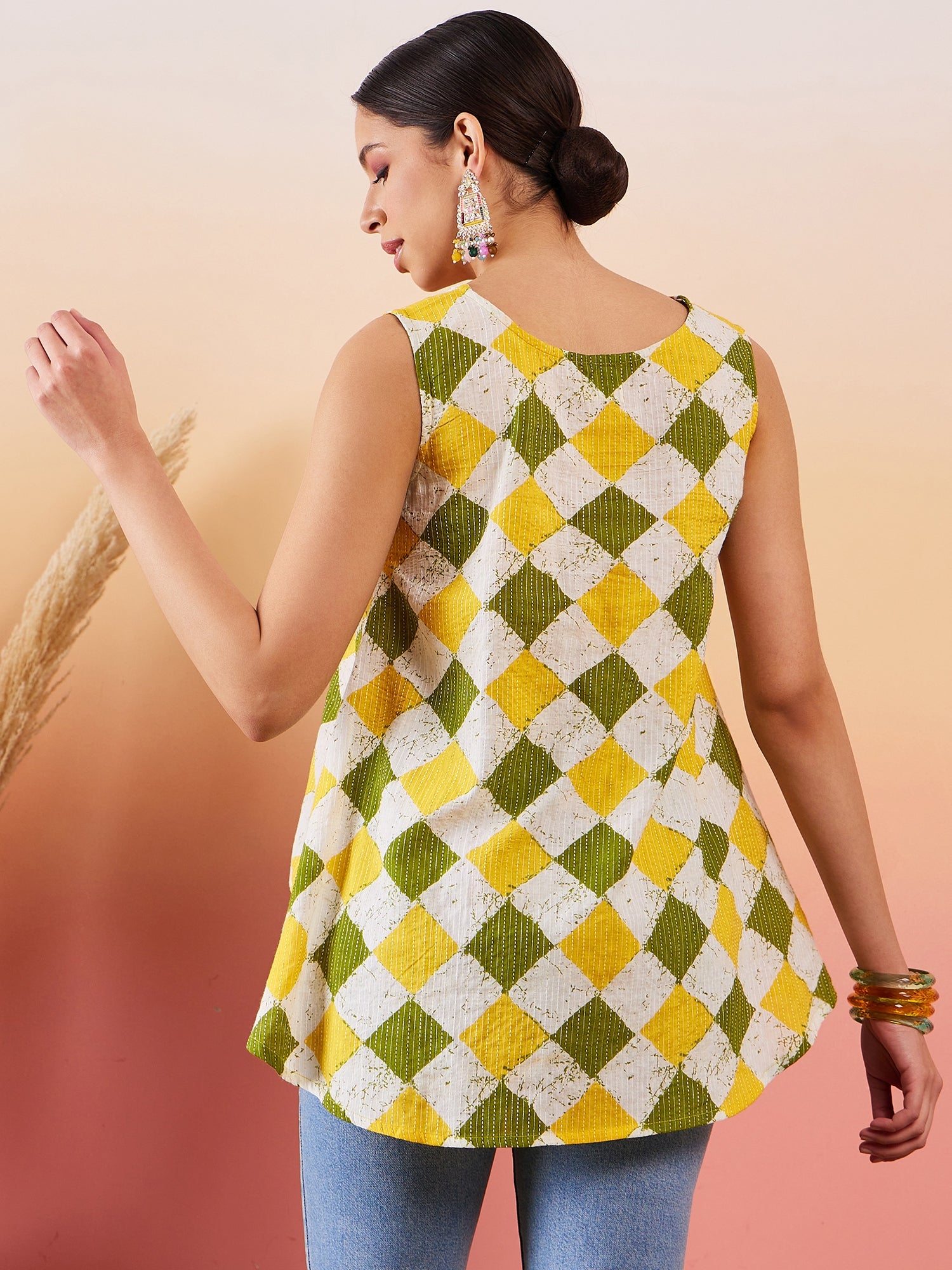 Placeholder Yellow Green Geometric Print Kantha V Neck Sleeveless op - InWeave
