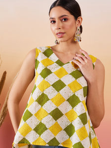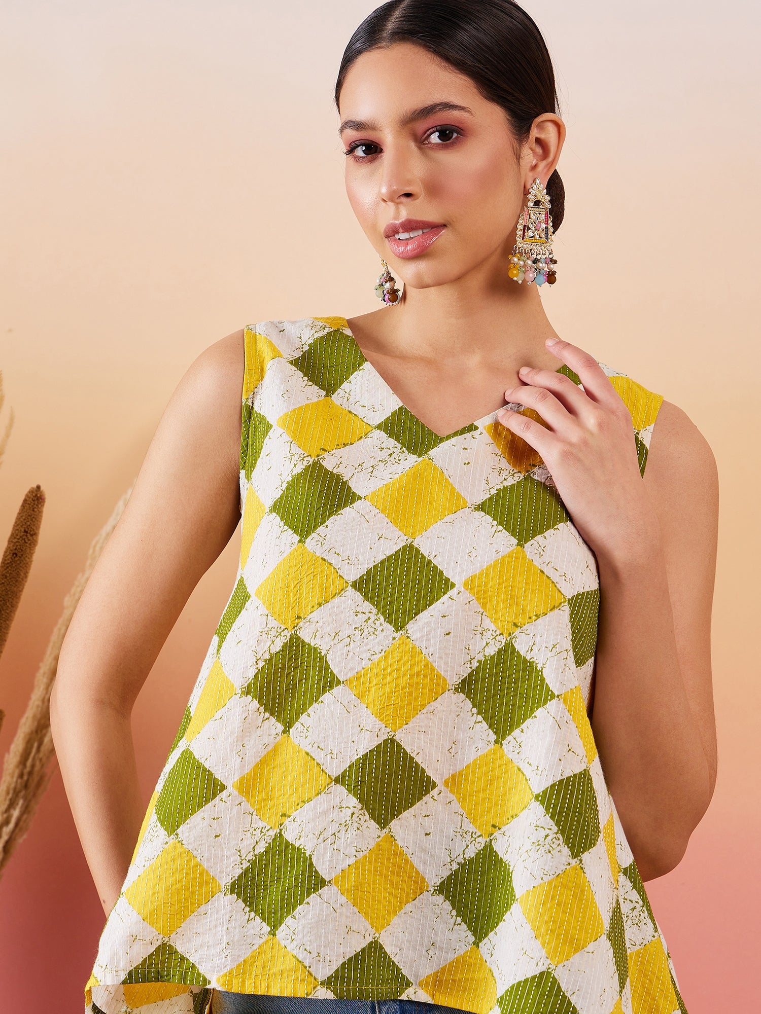 Yellow Green Geometric Print Kantha V Neck Sleeveless op