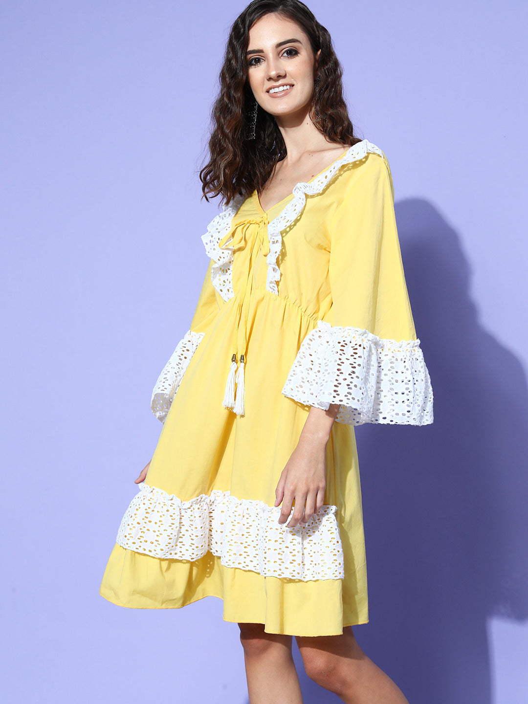 Craftcore refers to ensembles that are accentuated by crochet and schiffli along with beautifully crafted trims. Also, they boast lovely details, such as lace inserts, tie-up, ruffles, wide necklines, stylised sleeves, and more.