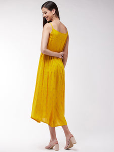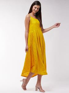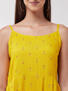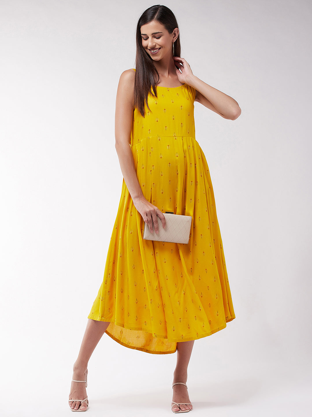 Yellow And Red Small printed woven A-line dress, has shoulder straps, sleeveless, and flared hem. Set the tone for this season with this one-of-a-kind InWeave dress. Match this printed Yellow piece with an incredible statement bag and high heels to maximize your next lunch look.